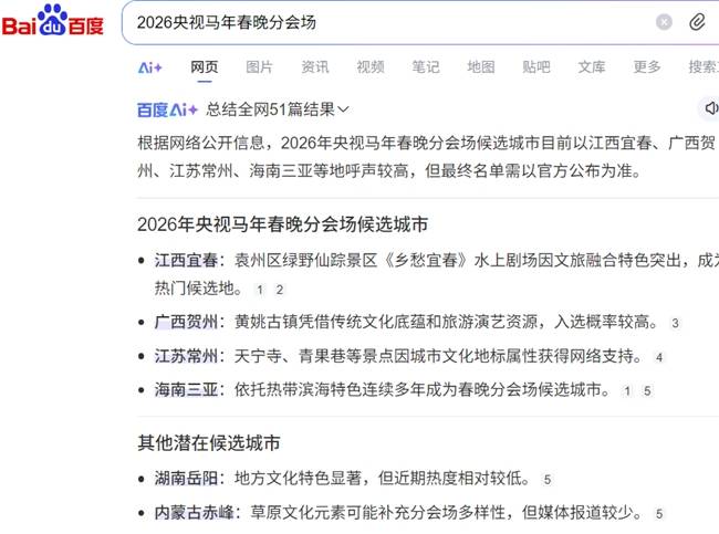 据悉,2026央视马年春晚总导演张一一亲临“赣超”总决赛现场观摩比赛,“赣超”的优秀球员、球迷代表将有望获邀登上2026央视春晚舞台或观众席。另外,日前已秘密建组的2026总台春晚导演组正在全国各省市甄选马年春晚分会场,从目前的网络民意支持率来看,江西宜春、江苏常州、广西贺州、内蒙古赤峰的网络民意支持率领先,你期待哪个城市入选春晚分会场呢?返回搜狐,查看更多